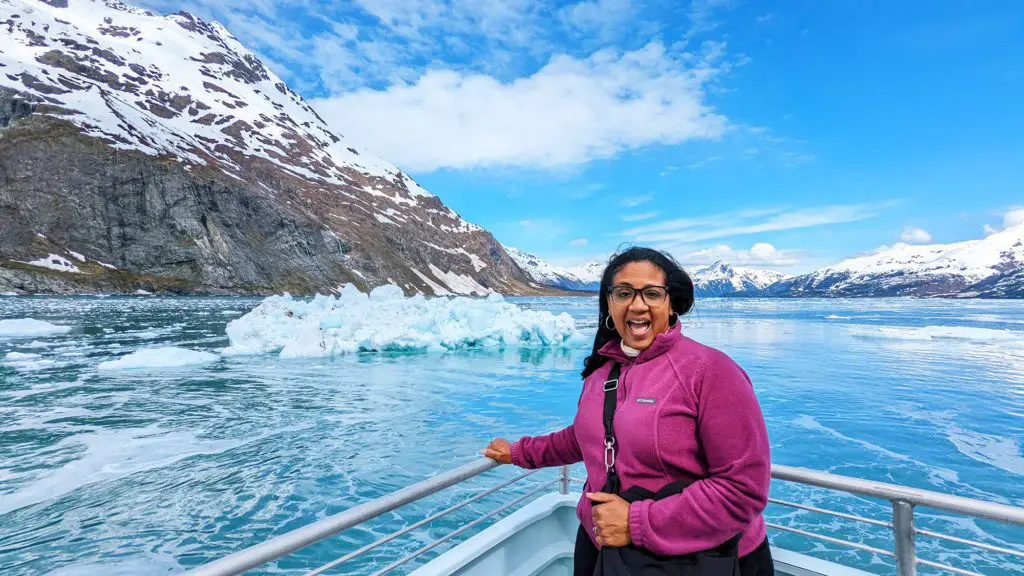 When we booked our tour we choose to get the 26 Glacier Cruise included and it pairs perfectly with a round trip or one way train ride from Anchorage. Even though our train was a little late getting in, they held the boat for the train passengers. The 2 companies work in conjunction, so if you are riding the train and taking the 26 Glacier Cruise, you’ll be in good hands. You just step off the train and walk across the street to where the glacier cruise starts. On that day a Holland America cruise ship was also in port.